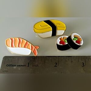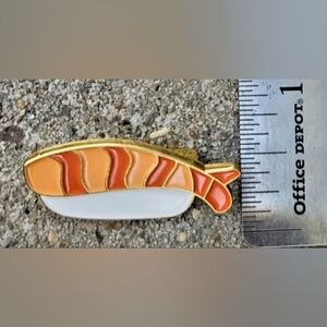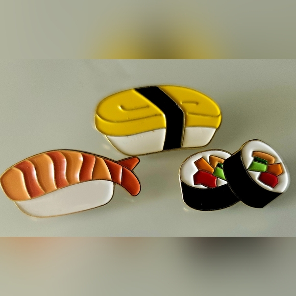 Colorful sushi enamel pin set with gold accents. Features vibrant red, orange, and green details. Tamago, shrimp sushi, and California roll.