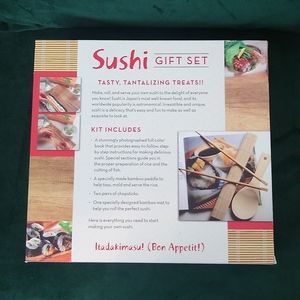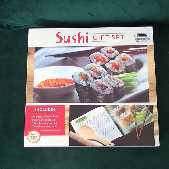 Mud Puddle sushi gift set, comes with book, 2 pairs of chopsticks, one bamboo rice paddle, one bamboo rolling mat