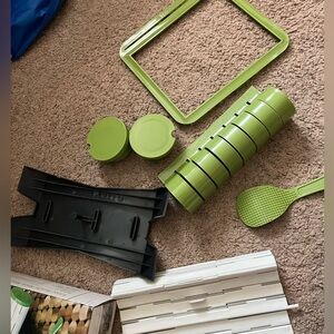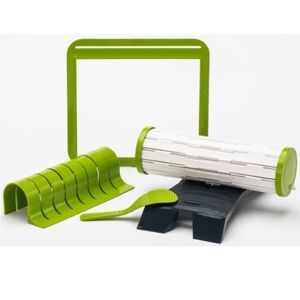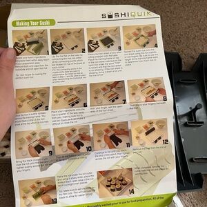 SushiQuik sushi maker in new condition, never used. Contains instructions for use, cleaning and a link to videos. Has roll cutter, rice paddle, pre-measured rice frame, and sushi rolling mat. Dishwasher safe.