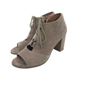 Susina Taupe Suede Shay Lace Up Peep Toe Suede Ankle Boot Heeled Booties in Woman's Size 7.5. Buttery-soft suede styles a smooth peep toe bootie lifted on a stacked chunky