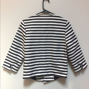 Three quarter length sleeve, navy and white striped, fully lined blazer by Susina. Very flattering cut that is slightly cropped in the back. Great for work or the weekend!