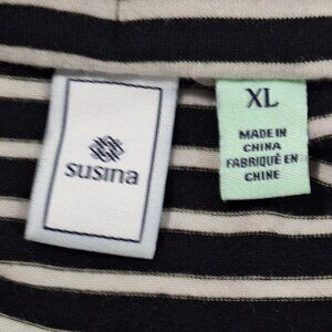 Susina Black & Ivory Stripe Side-Ruched Skirt (XL) — NWT. Effortlessly chic and flattering, this black and ivory striped skirt from Susina (Nordstrom Rack) combines comfort and style. Features a drawstring side tie that lets you adjust the length and create a ruched effect — wear it as a midi or mini depending on your mood! Perfect for casual weekends, travel, or pairing with your favorite tee and denim jacket.