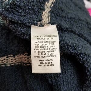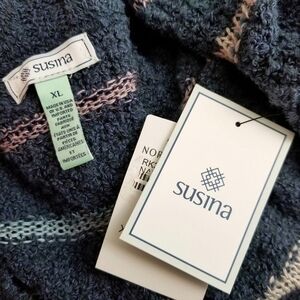 Susina sweater in blue with a multicolored pastel striped pattern. It is new with tags. It has a scoop neckline and long sleeves.