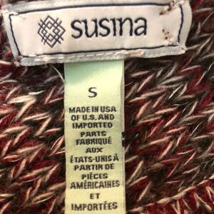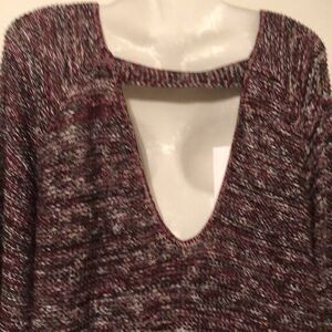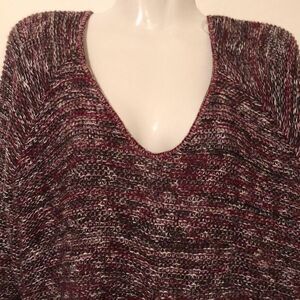 Susina women’s sweater. Burgundy marl color. (Burgundy, black, white, gray) Deep V-neck front, open V back with strap. Long sleeves. Pit to pit 22”. Shoulder seam to bottom hem 27”. Boxy shape but full of pizazz. Lightweight. 85% acrylic 15% rayon. Made in the USA. S