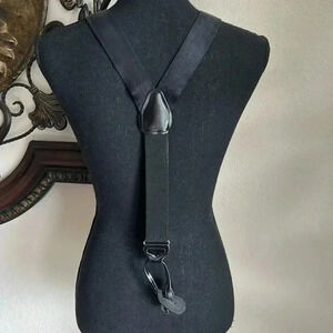 100% black silk fabric unisex braces suspenders Made in England in EXCELLENT condition! No holes in silk and no scratches on gold tone hardware or leather. Black patent leather loops. ****Models are wearing similar suspenders*** Also available in Navy Blue in my closet.