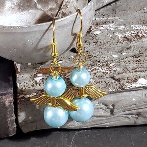 Sustainable Christmas Holiday Angels Gold Plated Light Blue Glass Pearl Earrings