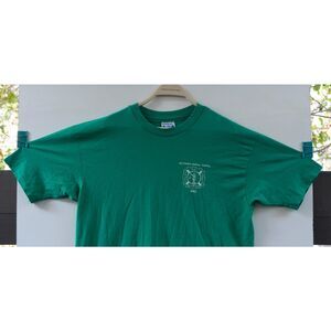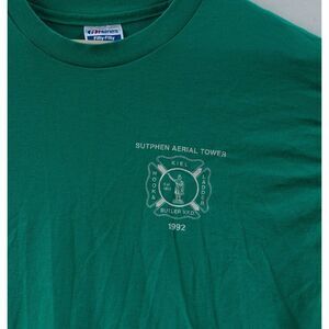 Sutphen Aerial Tower Hook and Ladder Fire Department 1992 Green Single Stitch T-Shirt Size XL. Shirt has pin hole on top shoulder in the back and small tear in the back middle (see photos).