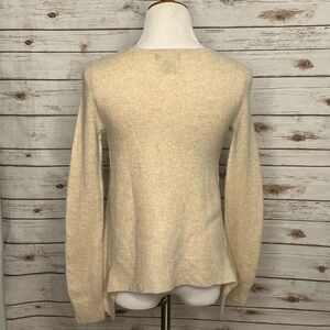 Cream; V-neck; long sleeves; ribbed knit cuffs and hem; A-line hem