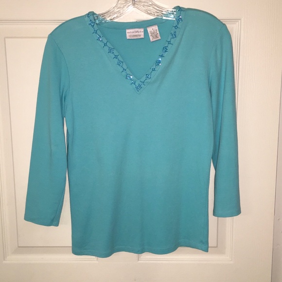 Turquoise 3/4 sleeve top ...EUC..only worn a few times...100% cotton.. bugle bead design at V neckline...chest laying flat is 17 1/2"...center back length is 22"