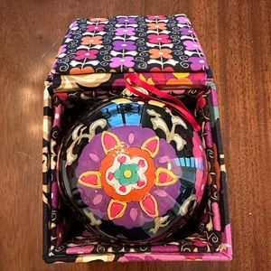 Hand-painted (from the inside)glass ornament dated “2011”. 4-inch diameter in size and presented in a coordinating keepsake box with button closure.