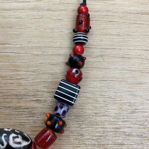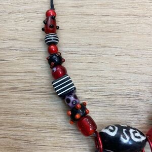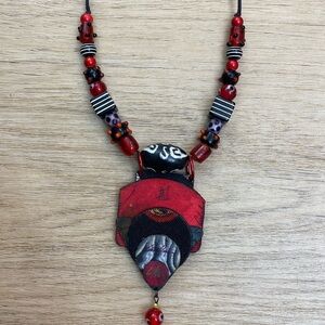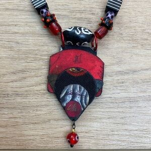 Cloth medallion and glass lamp work bead necklace by Suzanne Bellows. Red and black. In excellent condition.