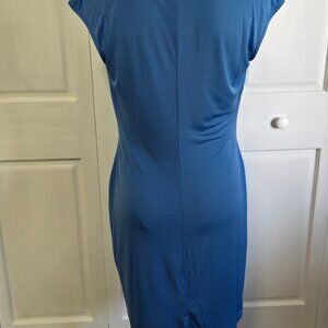 A stylish Suzanne Betro Ruched Powder Blue Dress. This dress features a draped neckline and strechy fabric that hugs those curves in all the right places. The Ruched area in front takes away from your belly. Comfortable, lightweight, great dress for a wedding, cruise, or nice dinner. This dress is very stretchy and comfortable to wear. One minor flaw manufacturer tag is coming off. See in picture.