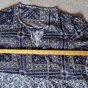 Boho-style dress in navy blue and white tones, featuring a mixed print and convenient side pockets. Loose and comfy fit with 3/4 sleeves and a subtle ruffle at the bottom. Perfect for warm days or a relaxed, stylish look. Comes with side pockets for added practicality!pre-owned does not include size and materials tags as they were cut off