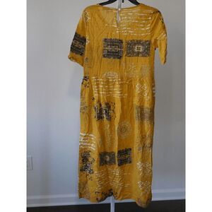Suzanne Betro Marigold & Brown Abstract Drop Waist Midi Dress S