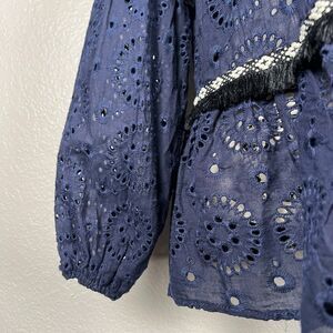 The Suzanne Betro Sz L Navy, Black, and White Cutout Open Cardigan Jacket with Fringe is a stylish and versatile piece perfect for various occasions, from casual to formal. Made from 100% cotton, this long sleeve cardigan features a geometric pattern and tasseled accents, adding a unique touch to your wardrobe. The round neckline and open design make it easy to layer over your favorite outfits, while the blue color offers a classic and timeless look. Machine washable and suitable for all seasons, this cardigan is a must-have for any fashion-forward woman.