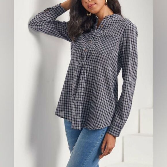 Long-sleeve henley top featuring a classic plaid print and button-up front. Breathable cotton.