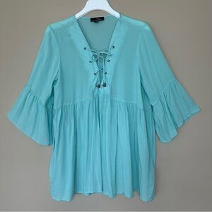 Suzanne Betro Women 1X Babydoll Tunic Top Pastel Baby Blue Bell Sleeves Lace Up