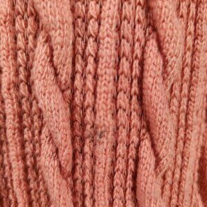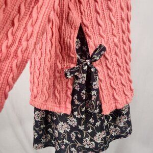 This top is in excellent condition. Very clean. There is one really tiny spot on the back that I did not try to clean. Outer shell is pink cable knit sweater, lining is dark blue floral polyester. The sides of the liner have ties below the sweater.