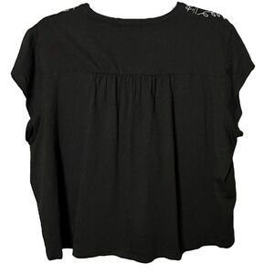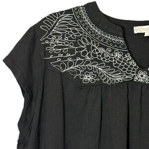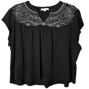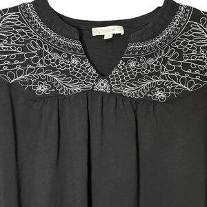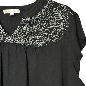 Suzanne Betro black white embroidered tee size 4X. Great condition see photos for details. Care tag removed. Approximate measurements 23” length 30” width at bust fully laid out flat. Would fit differently depending on bust size.