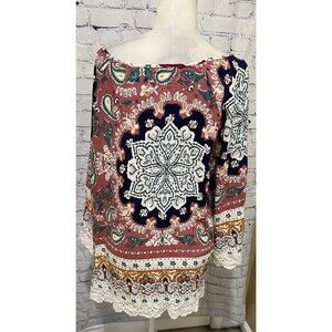 Suzanne Betro paisley boho Rayon Belle Sleeve Lace Accent top size 4x