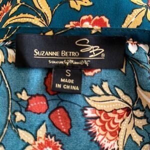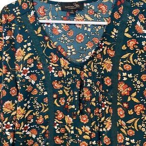 Suzanne Betro women's bohemian fall colors floral top. Contrasting green lace strips on chest Three buttons at neckline with sewn pleats. Pit to pit 20" shoulder to hem 27" Size Small