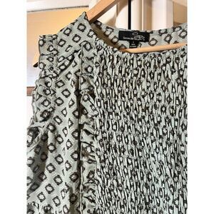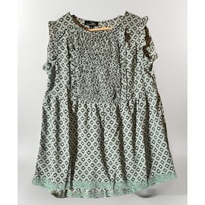 The Suzanne Betro Blue Smocked Empire-Waist Tunic is a stylish and comfortable sleeveless blouse perfect for women looking for a prairie-inspired look. The high neckline and sheer detailing add a touch of elegance to the cottagecore style tunic. With a relaxed fit and empire waist, this tunic in size L is ideal for everyday wear or dressing up for a special occasion. The blue color adds a pop of vibrancy to the overall look, making it a versatile piece for any wardrobe.