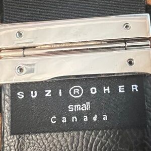 Hardware: It has a large rectangular central buckle in glossy black with a silver-tone metal trim around the edges. The silver details give it a sleek, futuristic vibe.
