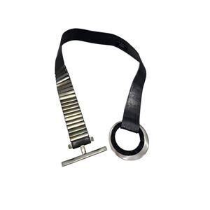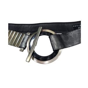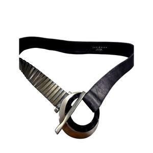 Suzi Roher rare vintage leather metallic pewter color belt. 33 inches long / extra large. Silver toggle closure with silver slates design. Comes with dust bag.
