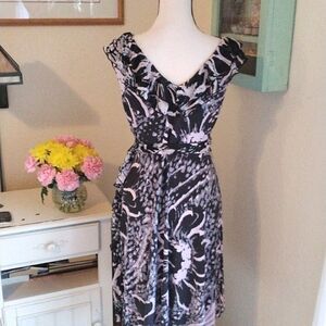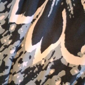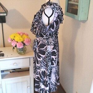 This true wrap dress ( opens like a robe) is comfortable and great looking. Ruffles at neckline, and down the left side when closed. Ties at waist for a perfect fit. Pretty blush pink, gray and black bold floral graphics. Size 12 P measures 40 at chest, 30 at waist, ties adjust fit here. 44 at hips. 40 long from shoulder to hem. Perfect for work and play.