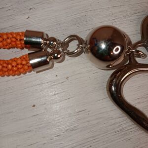 Add a pop of color to your outfit with this beautiful Suzie Blue long orange beaded necklace. The necklace features a large metal heart pendant that measures 2.5"x3". The necklace is 19 inches in length. The bohemian and Signs & Symbols themed necklace is perfect for any casual occasion and can be paired with any outfit of your choice. The main color is orange, and the necklace is made in Indonesia.