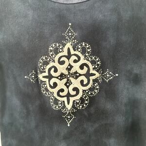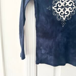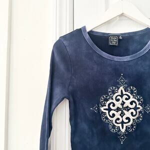 Size medium from Suzie in the City. Navy blue tie dye white embellished cross swirl diamond design across chest. Fitted. Preowned in good condition with no stains or tears,