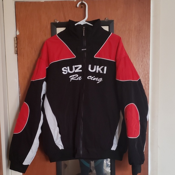 Suziki racing jacket. Jacket is soft comfortable material. Warm and well made. Excellent condition! Wore a few times.