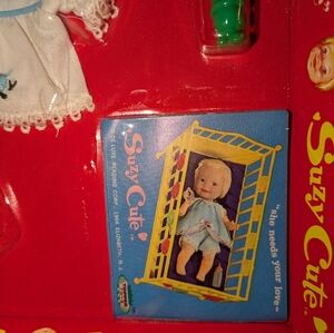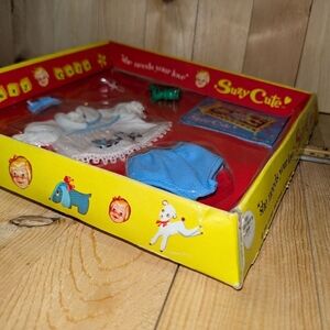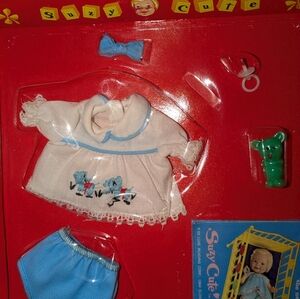 Adorable Suzy Cute doll outfit set. Includes a white dress with blue accents, blue shorts, and accessories. Perfect for doll enthusiasts.