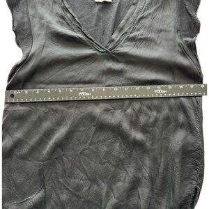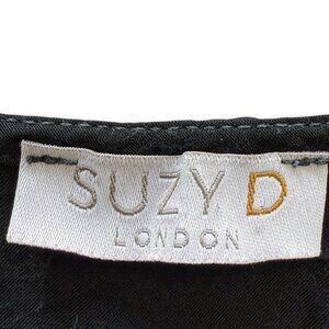 The Suzy D Top in size small is a classic black blouse with flutter sleeves and a V-neckline, made from viscose satin fabric. This wardrobe staple features a minimalist and neutral design, perfect for a capsule collection of basic and versatile tops. Whether worn alone or layered, this top by Suzy D is a stylish and timeless piece that can be dressed up or down for any occasion.