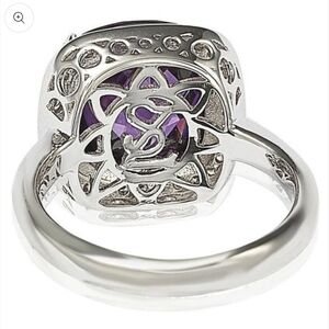 This ring features a cushion-cut purple cubic zirconia center stone with round-cut white cubic zirconia around it, hand set in sterling silver. A special Suzy Levian signature secret stone inside and a unique Suzy Levian designer gallery complete this piece