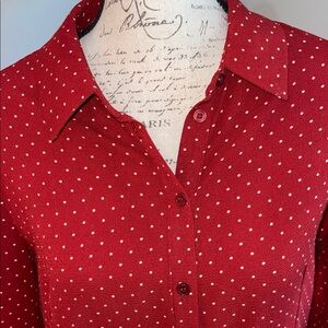 Chic dark red dress with cream polka dots. Three quarter sleeves that tie. Classic shirt collar button-up front. Perfect for stylish outings. From a pet, smoke and flood free home.