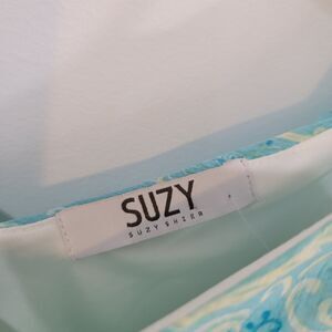 This Suzy women's midi dress in size small features an off-the-shoulder neckline with ruffle accents, made of chiffon material in a blue and green floral pattern. The dress has short sleeves and a high waist, perfect for occasions like travel, weddings, casual outings, or business settings. With a fairy and nature theme, this lightweight dress is ideal for summer, fall, and spring seasons.