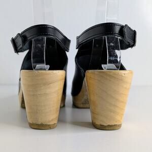 Elegant black leather mules. Features a sturdy wooden heel. Adjustable strap for comfort.