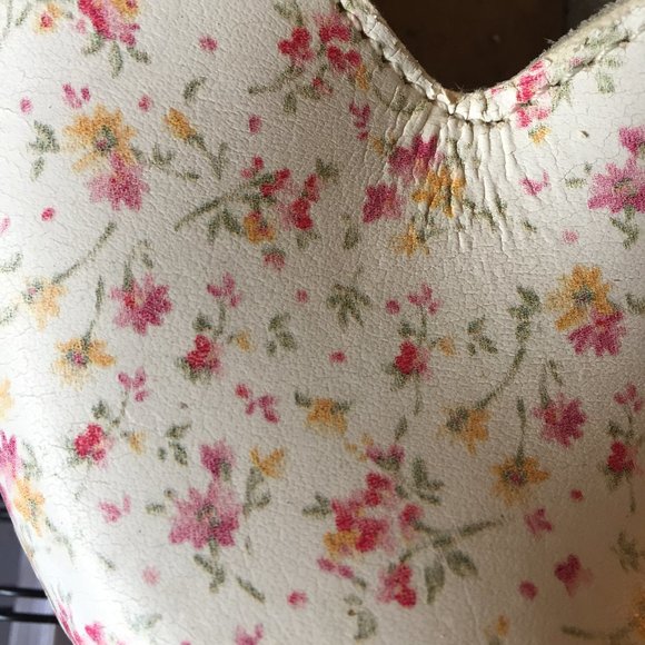 Step into Spring with these sweet floral clogs! Delicate pink, yellow and green ditsy print on cream fused onto leather. Wooden base. Marked size 37 = 6 in US. Footbed 9.25 x 3". Heel 3". There is some degradation of the print layer. The right shoe is especially damaged. Price reflects this issue. In fair used condition.