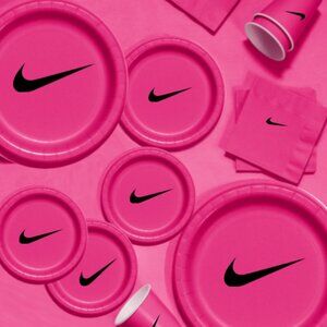 Fun & Stylish Design. The bold Sw00sh silhouette on vibrant pink background makes your party table look sharp and coordinated.