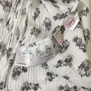 Swaddle Designs Disney Minnie Mouse Baby Swaddle Blanket Lovey Muslin Cotton. Has been used and washed, my daughter had a large rotation of swaddles that she slept with, so has had a lot of love. Some pulls in the material, and there is a small spot - please see the pictures. Such a cute swaddle with a ton of life left.
