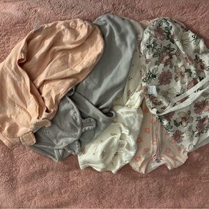 Set of baby swaddles featuring floral and solid designs. Includes pink, cream, and gray colors.