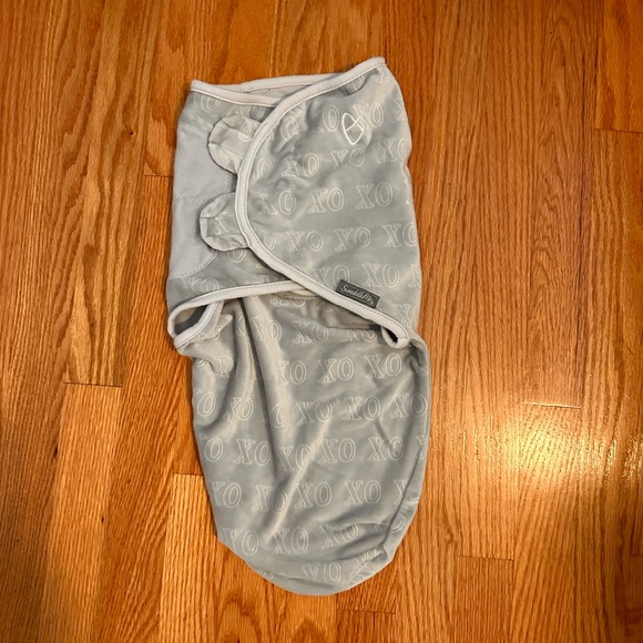 Barely used SwaddleMe, sized medium small. I had a summer baby and this one was just too warm for him. The outside is a velvety fabric.