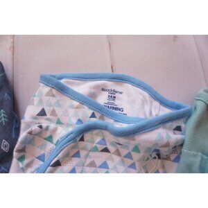 Set of 3 cotton swaddles in assorted colors and patterns. Each features adjustable hook-and-loop fasteners and soft fabric. Suitable for comfortable sleep.