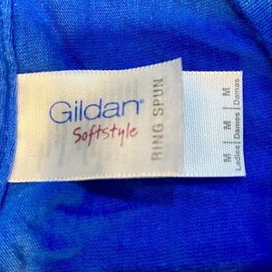 Blue short sleeve, v-neck top with "SWAGGER" shiny gold text across front and "Gotta Dance" text on sleeve. Gildan Softstyle Ring Spun shirt.