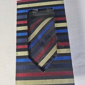 Elevator your style with this Shallow Fight men's tie set. Perfect for any occasion. This set includes a black tie with horizontal stripes in red, navy, cobalt blue and gold. The stripes have a diagonal texture to the stripes, cuff links and a pocket square, all made of high quality materials. The. tie set features the Swallow Fight brand and is designed for men making it an excellent addition to any wardrobe. The set is ideal for those who appreciate quality and style. And it comes in its original box, making it a perfect gift for any occasion. Whether you're dressing up for a formal event or adding some flair to your everyday look, this tie said it sure to impress. Condition: Tie set is brand new, the box shows a tiny bit of wear from storage. Non smoking pet free home.