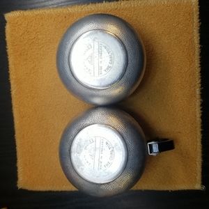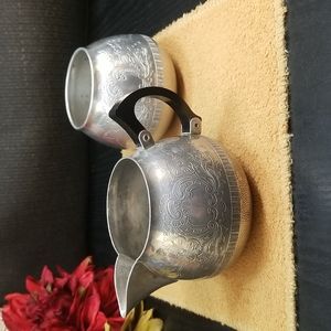 Vintage mid century Swan Brand 'The Carlton' pattern Cromalin {aluminum, zinc alloy mix} stamped rococo floral design open sugar and creamer with bakelite handle. Creamer is 5 ½" handle to spout and 3 ¼" tall, sugar has a 2 ½" mouth diameter, and is 3" tall. Made in Birmingham England. Have some inside spotting and could use a good polishing. Sugar has a tiny dent ( see last 3 pics ).