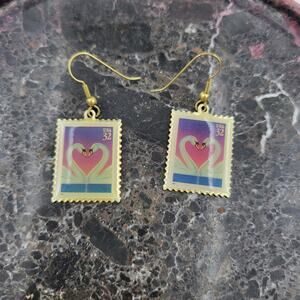Swan Love 32 Cent Stamp Dangle Earrings Heart Gold Tone Postage Mail USA