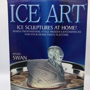 Swan ice art: Make your own ice sculpture at home. Just fill the mold with water while it is hanging from the assembled freezer rack, place it in your freezer and freeze overnight. You will end up with an elegant ice swan that you can surround with food or use in a punch bowl for your next special occasion. Reuseable form. Good preowned condition; clean thoroughly before use. Swan is about 9” tall, 5” wide, and 7” deep. Rare, hard-to-find item.