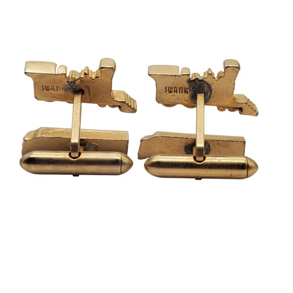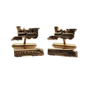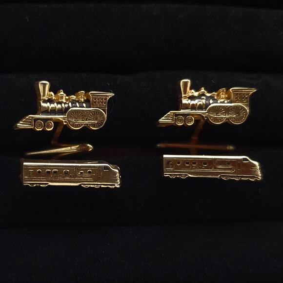 Very cool and unusual Swank train cufflinks. They are gold tone with black enamel accents.